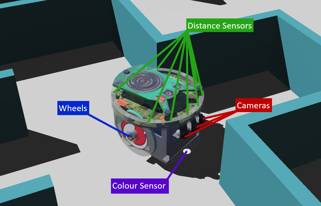 By default the robot will be a standard e-puck robot, which is a representation of a real robot. Alternatively teams may modify the standard robot in order to change the position or number of sensors and wheels.